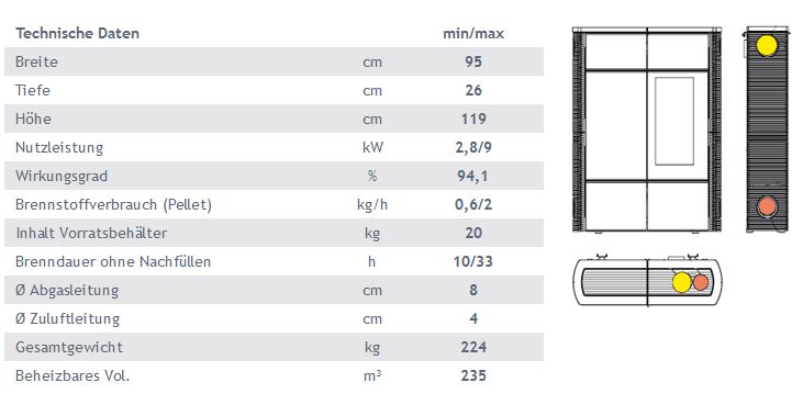 | Abgasnormen/Zulassungen | CE-Kennzeichnung Zertifiziert nach EN 14785 (Pellet-Heizöfen) 15 a BV-G Österreichisches Emissions-Gesetz FLAMME VERTE Französisches Zertifizierungszeichen IMQ Italienisches Institut für Qualitätszeichen VKF Produkt-Zertifizierung der Schweiz PCT Russische Produkt-Zertifizierung SINTEF Norwegische Produkt-Zertifizierung |